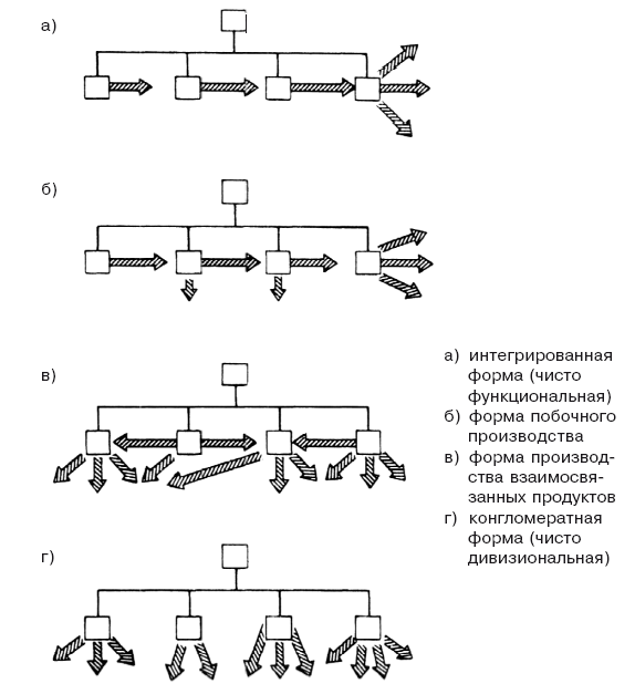 Среди переходных состояний выделяются две главные модели, обе связанные со стадиями структурного развития организаций. Первая встречается в организациях, которые начинают свою жизнь в простой внешней среде; она охватывает левую часть пентагона, начиная сверху. Большинство организаций начинает свою деятельность с простой структуры. Взрослея и развиваясь и, возможно, подпадая под внешний контроль, они склонны формализовать свое поведение и в конечном счете делают первый переход, к механистической бюрократии. Продолжая расти, организации нередко разнообразят свою деятельность, диверсифицируются, а впоследствии могут начать второй структурный переход, к дивизиональной форме. Они могут остановиться на каком-то промежуточном этапе, приняв гибридные формы – производства побочных или взаимосвязанных продуктов, – либо дойдут до чистой дивизиональной формы. Но, как мы отмечали в гл. 11, эта структура может оказаться непрочной и тогда возникнут предпосылки для следующего перехода. Учитывая дивизиональные зависимости, организация может вновь объединиться, вернувшись к механистической бюрократии, или превратиться в новый гибрид на пути к адхократии.