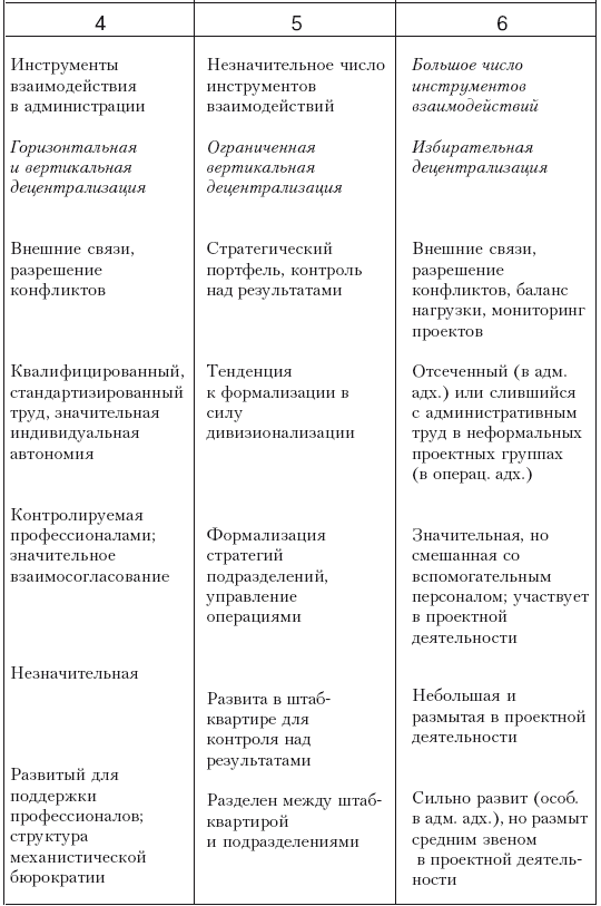 Любое взаимное согласование, необходимое для укрепления стандартизации норм, может осуществляться неформально, поэтому структура испытывает ограниченную потребность в полуофициальных инструментах взаимодействий. Иначе говоря, перед нами конфигурация параметров дизайна (и ситуационных факторов), которая последовательна не менее чем любая другая и в буквальном смысле является гораздо более гармоничной.[64]