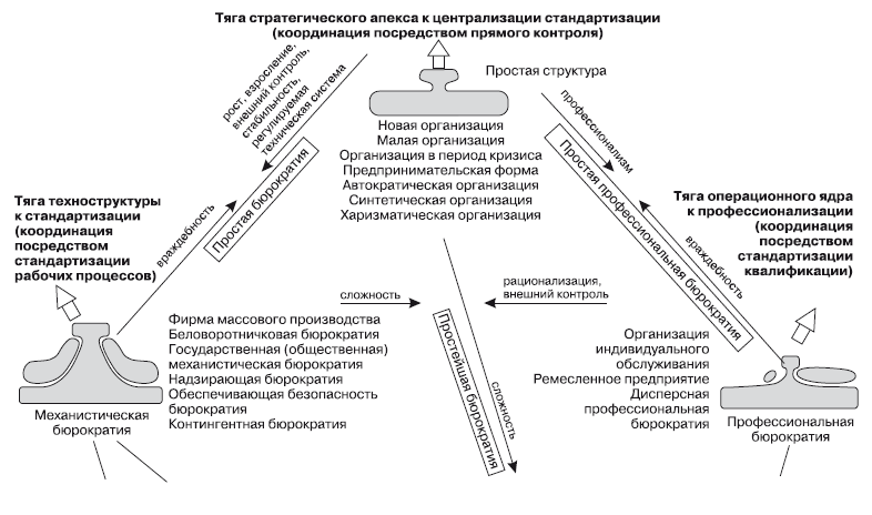 Конечно, эта последовательность может быть нарушена вмешательством множества других сил. Усложнение внешней среды или технической системы новой организации подтолкнет ее не к механистической бюрократии, а к адхократии. А если механистическо-бюрократическая система столкнется с высокой сложностью в отсутствие стабильности, например в силу товарной конкуренции или необходимости в более сложной или даже автоматизированной технической системе, то и она предпочтет перейти к адхократии. Кроме того, любая зрелая организация, внезапно столкнувшаяся с враждебным окружением, может временно вернуться к простой структуре. Если же доминантной силой стал внешний контроль, то она вернется к механистической бюрократии.