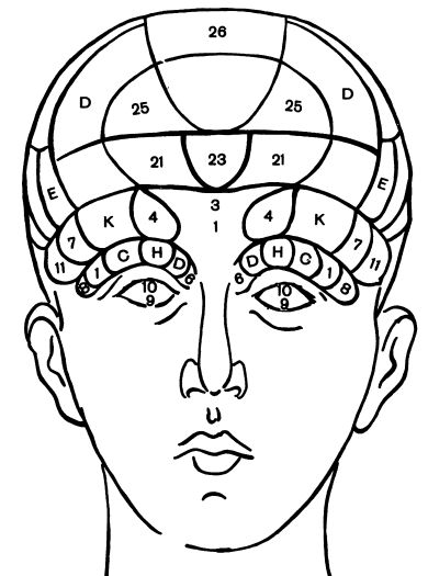 По системе основателя френологии Галля (род. в 1758 г. в Германии; в 1805 г. опубликовал свой труд под названием "Новая анатомическая и физиологическая система", в который вошла также его система разделения мозга на известные участки) мозг разделяется на следующие участки, из коих главнейшие показаны на рис. 1 (лоб) и рис. 2 (профиль):