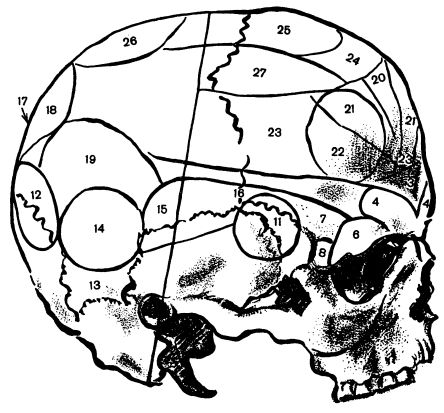 На рис. 3 и 4 изображен череп спереди и сбоку с френологическими обозначениями того же Галля, проверенными позднейшими френологами.