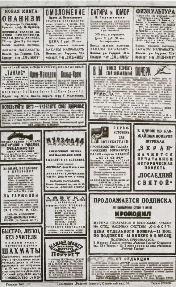 Реклама со страниц газет и журналов, с плакатов и витрин призывала граждан покупать в магазине, находящемся в доме 3 по Кузнецкому Мосту, мужскую обувь Зеленкина с клеймом на подошве. Представляете: не с дырой, а с клеймом! Это казалось верхом шика. В Верхних торговых рядах, то есть в ГУМе, можно было днем и ночью взять напрокат «роскошный» автомобиль. Парикмахерская «Базиль» в доме 6 по Кузнецкому Мосту предлагала мужчинам покрасить волосы, а женщинам — уход за красотой лица и маникюр, а также художественное исполнение постижа, то есть парика.