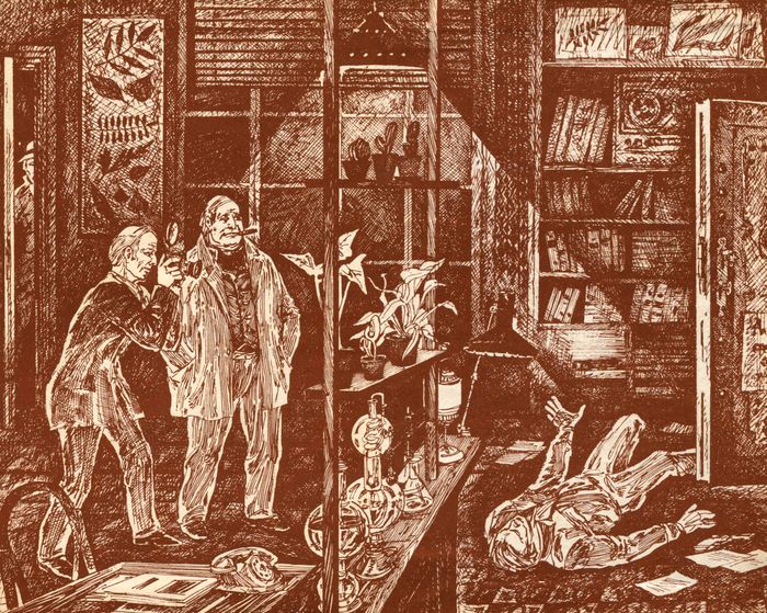 Доктор Зайдельбах, мужчина лет шестидесяти, держа перед глазами лупу, внимательно рассматривал листок папоротника. На довольно грязном халате доктора не хватало нескольких пуговиц, брюки его были сильно измяты, а про свитер трудно было сказать, какого он цвета.