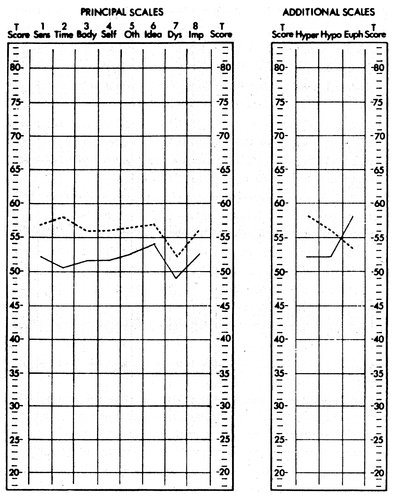 Результаты тестирования пациента в состоянии острого психоза. Тест проводился дважды за неделю до прохождения курсов по управлению разумом и один раз через неделю после курсов. Отметьте сходство результатов тестирования до обучения УРС в сравнении с результатами после обучения.