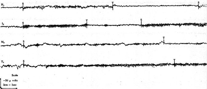 Аппаратное оснащение. Использовался элекгроэнцефалограф типа Т фирмы “Бекман”. Электроды из нержавеющей стали устанавливались подкожно в макушечной и затылочной зонах. За показаниями ЭЭГ осуществлялись визуальные наблюдения, а также велась регистрация на магнитной ленте. К магнитофону был подключен микрофон для записи словесных сообщений S. Логический программатор фирмы “Дигитал Эквипмент Корпорейшн” был настроен на показ двузначных чисел на записи. За лицом и верхней частью тела S велось наблюдение с помощью телекамеры. Все данные регистрировались на восьмидорожечном аналоговом записывающем устройстве Ampex SP 300.