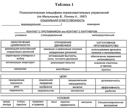 Важную работу по определению психологически значимых требований видов спорта, соревновательных упражнений и спортивных амплуа выполнил А.Л. Попов. За основу он взял основные понятия психологической теории деятельности. В соответствии со структурой деятельности в предлагаемой им психологической характеристике видов спорта выделены три главных фактора (см. таблицу 1):