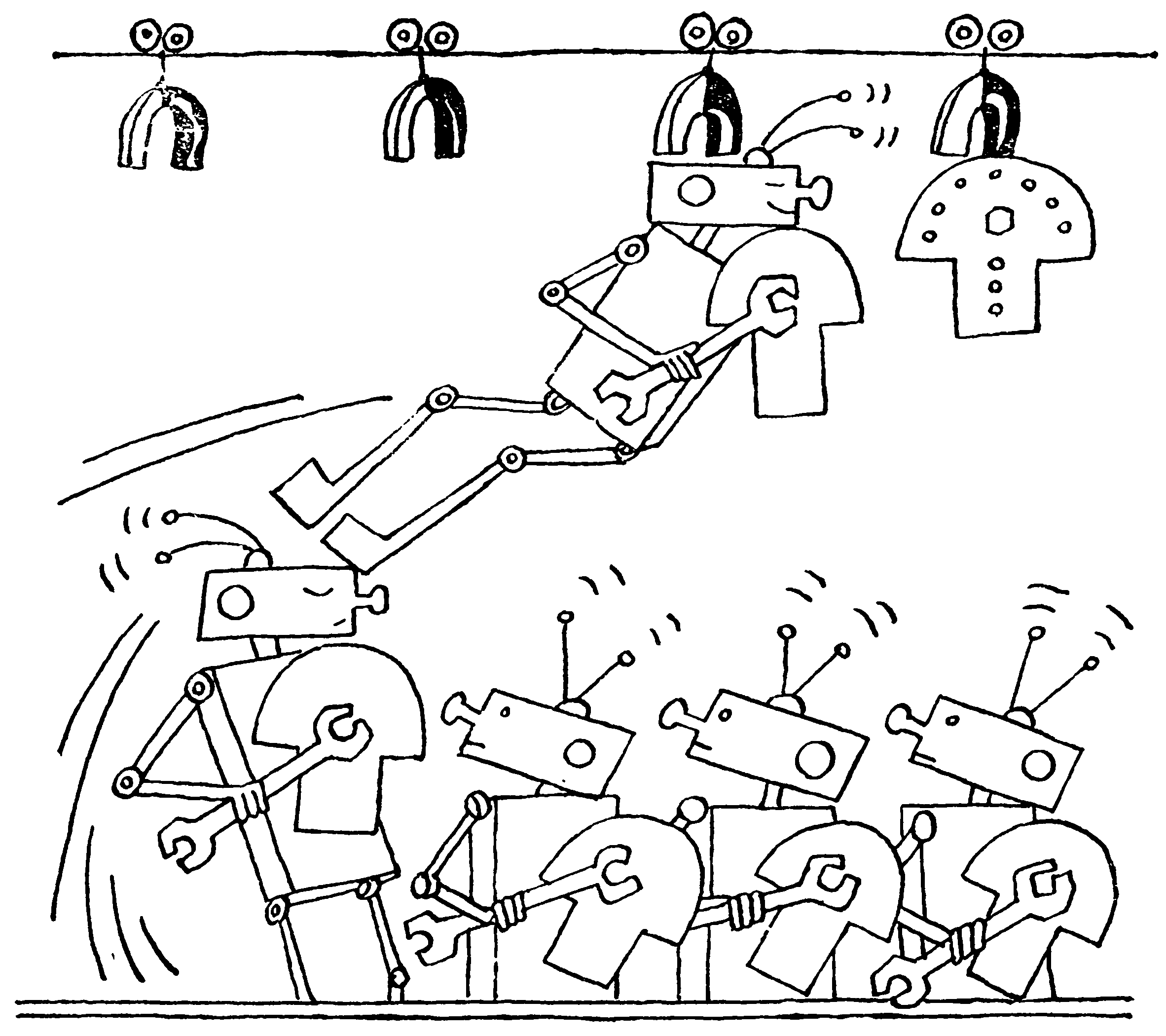 Обсуждая эту ситуацию, мы с сожалением вынуждены были отказаться от наиболее простого для нас выхода — не упоминая ни единым словом о роботах, которых вам рисует ваше воображение, окунуться в подробности устройства и действия тех роботов, о которых идет речь во всех технических прогнозах, и поступить иначе.