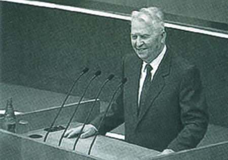 Инициатор борьбы за трезвость Е. К. Лигачев на трибуне.