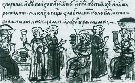 В эпоху становления государственности такие застолья становились своеобразным общественным институтом — совещанием князя со своими приближенными, дружиной, старейшинами: «Бе бо Володимер любя дружину и с ними думая о строи земленем, и о ратех, и о уставе земленем». На пирах-советах решались вопросы войны и мира, сбора дани с подвластных земель, принимались послы; былинные богатыри вызывались на «службу дальную»{8}. Торжественная трапеза закрепляла политический союз. Так, в 1147 году, известном как дата основания Москвы, в этой впервые упомянутой в летописи окраинной крепости Ростовской земли князь Юрий Владимирович Долгорукий (1125—1157) дал «обед силен» изгнанному из Киева Святославу Ольговичу. Пир мог стать и местом сведения счетов: тот же Юрий в 1157 году был отравлен в застолье киевскими боярами, а 60 лет спустя рязанский князь Глеб перебил собравшихся у него в гостях своих соперников-родственников.