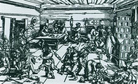 «Наши цеховые попойки будут на Вознесение и Масленицу», — постановили в XV веке кузнецы датского города Слагельсе и требовали от явившихся на праздник быть подобающим образом одетым (то есть не приходить босиком), соблюдать тишину в зале, умеренно пить и есть, не поить других «больше, чем уважительно, и сверх порядка», а после праздничного застолья не блевать по дороге домой, чтобы прочие горожане не могли увидеть столь недостойного поведения. Если кто-то все же «производит нечистоты в цеховом доме, во дворе, или создает неприличия задом, или обзывает кого-то вором или изменником», то почтенные ременники и сумщики Копенгагена постановили, что нарушители приличий «штрафуются на 1 бочку пива братьям и 2 марки воска к мессе». Сапожники Фленсбурга считали верхом безобразия (стоит вспомнить ходячее утверждение «пьян как сапожник») остояние, когда допившийся до рвоты пьяный собрат возвращался на свое место и продолжал пить{4}.