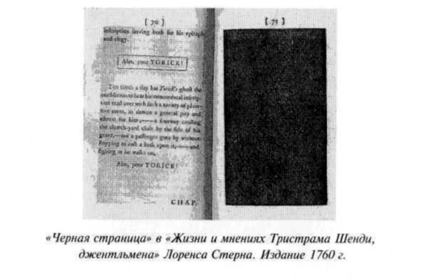 Фигура Йорика, по мнению большинства исследователей творчества Стерна, была важна для самого писателя автобиографическими аллюзиями глубоко личного характера. В этом случае черная страница выражает собою, быть может, нечто большее, чем эксцентричное стремление Стерна к типографическому разнообразию[357]. Чернота, визуально указывающая в данном случае на то, о чем уже невозможно говорить и что уже не нуждается в словах, при этом предстает амбивалентной: знаком конца, немоты, траура и вместе с тем знаком возможной надежды и продолжения — как это некогда подразумевалось и черным квадратом Фладда. Показательно при этом, что на возможную преемственность черной страницы Стерна с изображением «первичной материи» у Фладда указывали уже ранние интерпретаторы «Тристрама Шенди»[358]. Была ли эта преемственность осознанной — остается гадать, но те из читателей, для кого такая параллель была и остается важной, симптоматично видят за чернотой типографской краски, заменяющей собою предписанный для книги текст, не только образ хаоса и смерти, но и некоего нового начала.