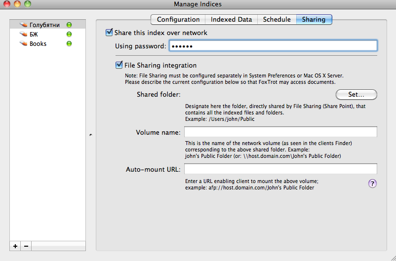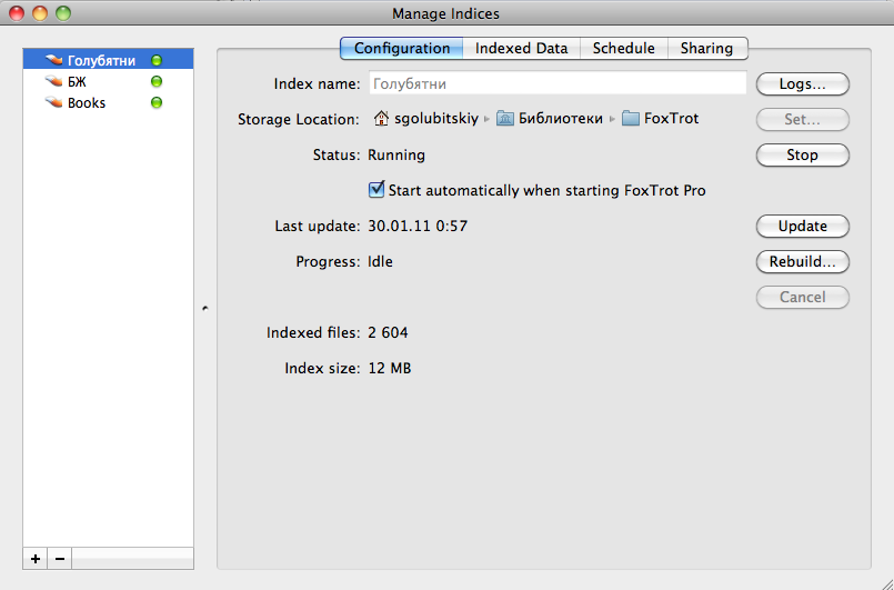 Из скриншота видно, что пользователь полностью управляет местоположением индекса, его включением и отключением, автоматизацией и планированием переиндексации, сетевым доступом (с возможностью парольной защиты):