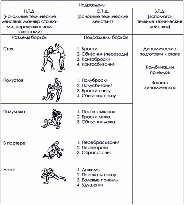 Вся техника борьбы состоит из 3 надразделов: начальных, основных и вспомогательных технических действий.