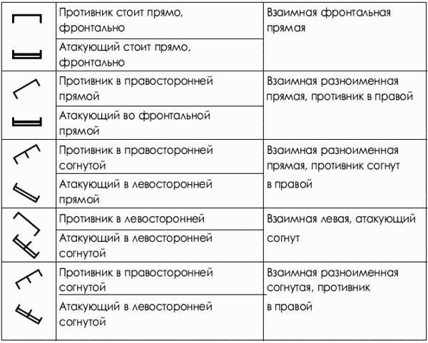 В процессе на сагиттальную плоскость различаются: прямая стойка (борец стоит прямо, не сгибая ног); согнутая (борец согнут в спине); низкая (борец стоит прямо на согнутых ногах); низко-согнутая. В борьбе возможны различные сочетания взаимных стоек (табл. 1.1), что накладывает отпечаток на составление комплексов приемов и вариативность их выполнения. Практика показывает, что взаимосвязи техники и тактики борьбы с вариативностью исходных взаимных стоек уделяется внимания недостаточно, особенно в начальном периоде обучения.