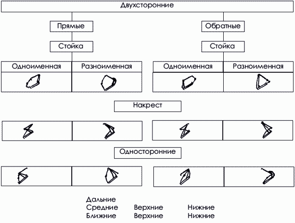 С тем чтобы достаточно хорошо усвоить технику спортивной борьбы на основе данной классификации, необходимо приложить усилия и терпеливо, используя своего товарища или хотя бы стул в качестве противника, проделать движения, обозначенные в нижеприводимых классификационных схемах. Этот труд окупится сторицей.