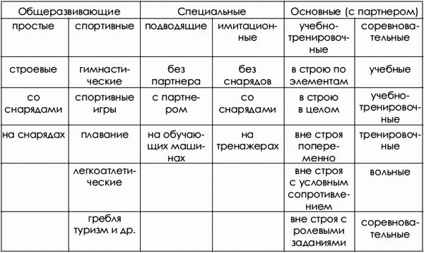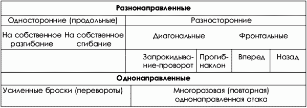 В видах спортивной борьбы предлагалось много классификаций ее техники. Действительно, каждая из них отражала уровень знаний в данной области. Впервые классификация приемов техники борьбы была предложена в дзюдо Д. Кано (А. П. Купцов, 1980), (схема 1.1).