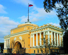 (4) Адмиралтейство – крепость-верфь. Оно было заложено в 1704 г. по карандашным чертежам Петра I, а уже в 1706 г. с его стапелей сошел первый корабль. В конце XVIII в. верфь была переведена в Кронштадт. Комплекс зданий трижды перестраивался; в последний раз – в 1806–1823 гг. по чертежам А. Д. Захарова. Спланирован он в виде буквы «П», открытой к Неве. «Шпиц с яблоком» и кораблик, ставшие одним из символов СПб, появились во время первой перестройки в 1719 г. Подлинник кораблика находится в Военно-Морском музее, а шпиль Адмиралтейства венчает его копия.