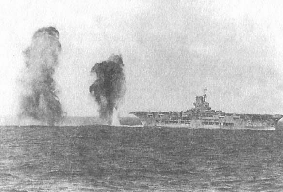 Итальянские бомбы падают вокруг «Арк Ройяла», Средиземное море, 1940 год.