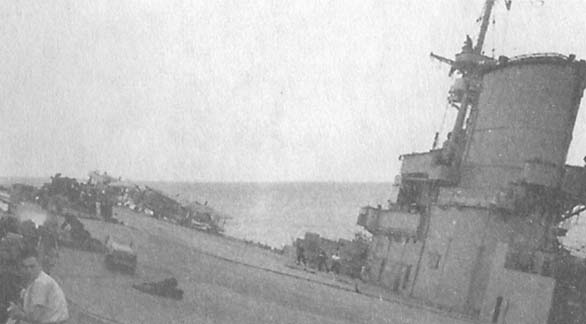 Перси Хэнкок остался как оператор аварийной радиостанции левого борта. Он привязал проволоку с грузиком к приемнику, чтобы видеть величину крена. Корабль кренился все больше и больше, и они могли слышать, как самолеты в ангаре катятся к правому борту и с треском врезаются в переборки.