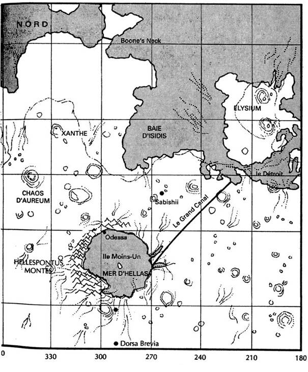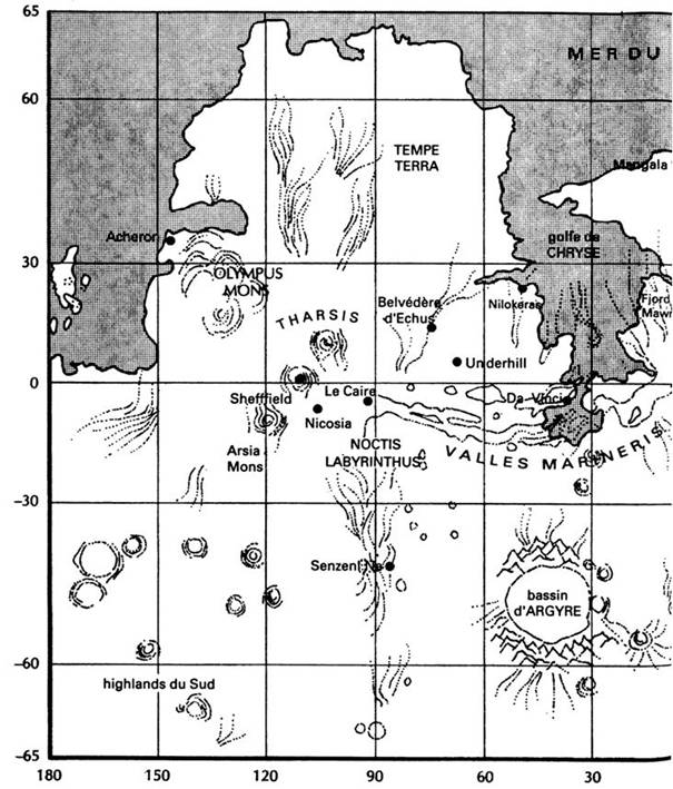 Ils achevèrent le montage de leur habitat d’hiver le 21 mars, à l’équinoxe d’automne. Après cela, l’alternance des jours et des nuits devint spectaculaire. Les rayons obliques du soleil jetaient leurs derniers feux avant de disparaître derrière la chaîne d’Olympus Mons, au nord. Commençait alors un interminable crépuscule précédant une nuit d’un noir de poix, piquetée d’étoiles. Ces nuits, de plus en plus longues, finiraient par ne plus faire qu’une. Une seule nuit qui durerait des mois. À cette latitude, la nuit éternelle commencerait peu après la mi-avril. Les constellations étaient les étoiles d’un ciel étrange, étranger à cet habitant du bout du monde qu’était Michel, et elles lui rappelaient l’immensité de l’univers. Chaque jour était sensiblement plus court que le précédent, et le soleil passait plus bas sur l’horizon, ses rayons filtrant comme des coups de projecteur entre les pics de l’Asgaard et d’Olympus Mons. Les gens avaient appris à se connaître.
