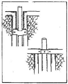 Основа вертикальных качелей с турником – три надежно врытых столба высотой 2 – 2,5 м (рис. 50). Перекладину для качелей делают из оцинкованной водопроводной трубы диаметром 1 дюйм. Концы трубы расплющивают, загибают и закладывают в подготовленные углубления в опорах, фиксируют двумя стальными накладками с шурупами. Скобы для подвески качелей ставят на гайках и фиксируют контргайками.
