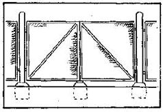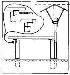 Горизонтальные качели (рис. 49) имеют опору – столб, врытый в землю, на котором укреплен небольшой отрезок доски толщиной 40 – 60 мм. Двумя скобками к нему прижимают отрезок водопроводной трубы. Горизонтальная доска качелей подкреплена снизу отрезком доски, к которой привинчены две скобы, охватывающие водопроводную трубу. На концах горизонтальной доски иногда укрепляют ручки.