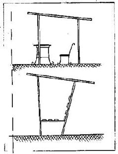 Туалет типа пудр-клозет считается в настоящее время самым рациональным и гигиенически чистым (рис. 56). В нем совершенно отсутствуют запахи (при правильной эксплуатации). В пудр-клозете должна находиться небольшая емкость (ведро или ящик) с торфом или опилками. После пользования туалетом содержимое емкости засыпается тонким слоем торфа или опилок, то есть оно готово для укладки в компостную яму.