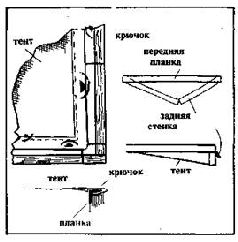 На рисунке видно, что в предбаннике оборудована небольшая скамейка и свободного места в нем очень мало. Поэтому при раздевании и одевании пленку над порожком распахивают, увеличивая площадь предбанника.