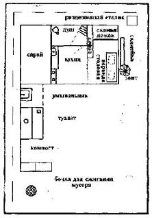 Основное строение такой зоны (хозблок) объединяет веранду-столовую, кухню с подвалом, горячий душ, сарай (рис. 51). Отдельно расположен туалет. Между туалетом и основным строением оборудован крытый умывальник. Рядом с туалетом вырыта компостная яма и стоит бочка (с сеткой в качестве колосника) для сжигания мусора.