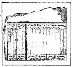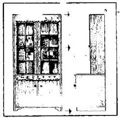 Настенный буфет трехсекционный. Две боковые секции буфета оборудуют дверцами из тарных дощечек, сплоченных на круглых шипах и клею. Снаружи они дополнительно скреплены шурупами с помощью двух накладных жиковин из полосового железа. На дверки навешивают декоративные ручки.