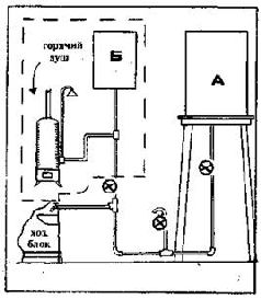 Устройство горячего душа требует особого пояснения. При отсутствии магистрального газа душ обычно оборудуют водогрейной колонкой, работающей на дровах и брикетах торфа.