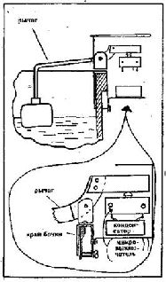 Как только уровень воды в бочке А снизится до какого-то определенного значения, поплавок своим коромыслом через «микрик» замкнет сеть насоса, и последний начнет нагнетать воду в бочку. В верхнем положении поплавок коромыслом разомкнет сеть, то есть отключит насос.