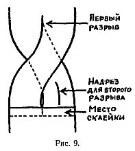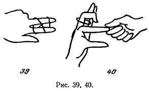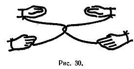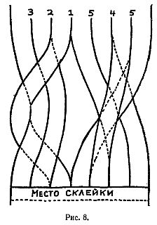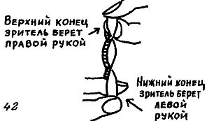 После небольшого размышления становится ясным, что в рассматриваемом фокусе, точно так же как и в предыдущем, применяется один и тот же принцип с пересечением рядов. Однако в последней варианте «пружинка» замаскирована гораздо лучше, благодаря чему получается значительно больший внешний эффект.