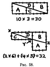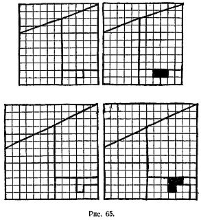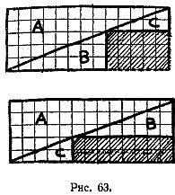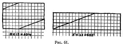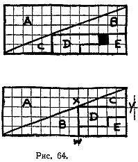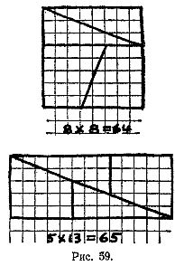 Перед вами обычная квадратная шахматная сетка из 64 клеток. На ваших глазах делается несколько разрезов и из получившихся частей составляется прямоугольник, в котором, однако, всего 63 клетки!