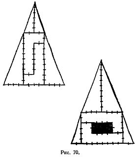 Так выкладываются четыре кучки, после чего числовые значения «непобитых» (открытых) карт, лежащих сверху кучек, складываются. Отсчитав теперь из катоды это число карт, зритель обнаруживает под последней из них выбранную им карту. Этот вариант фокуса гораздо эффектнее прежнего, так как выбор карт, входящих в сумму, кажется совершенно случайным, а «принцип компенсации», на котором основан фокус, скрыт значительно глубже[4])
