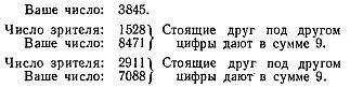 Если вы хотите еще более затемнить метод получения чисел, цифровой корень которых равен 9, вы можете перед существенным в этом методе действием вводить произвольные числа и операции. Например, можно предложить зрителю записать количество мелочи в его кармане, умножить это число на число людей в комнате, прибавить к результату самый знаменательный год в его жизни и т. д. и, наконец, умножить результат на 9. Ясно, что только последнее действие имеет отношение к делу. Как только получено число, цифровой корень которого равен 9, вы можете предложить зрителю обвести какую-нибудь цифру результата кружком и показывать фокус, как это было описано выше.