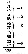 Если же дать показывающему право называть слагаемые, чередуясь со зрителем, то он может получить желаемую сумму, не пользуясь при этом никакими нематематическими средствами. Самый простой и самый старый метод для этого следующий: допустим, что вы хотите получить в ответе 23 843. Отбросьте первую цифру, т. е. 2, а затем сложите ее с оставшимся числом, получится 3845. Это число вы напишите первым.