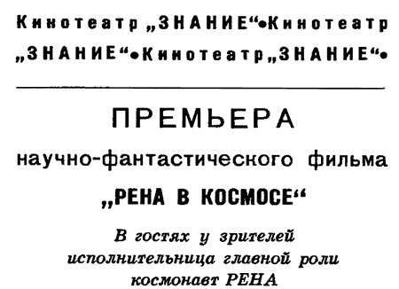 — Наш фильм тоже мечта, — продолжал режиссер. — И мне сегодня немножко грустно, потому что он проживет недолго. Скоро, очень скоро человек полетит в космос и с ним случатся неожиданные, удивительные приключения… Но я буду очень рад, если вы хоть однажды вспомните фильм «Рена в космосе». Значит, наша работа была не напрасна…