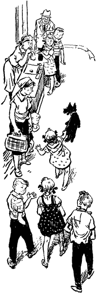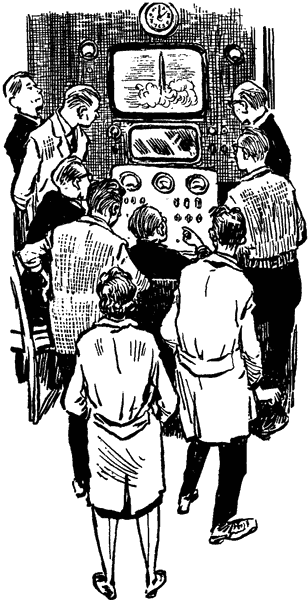 Ого! На рисунках наши герои! Только они совсем уже взрослые. В далекий рейс во Вселенную отправляется космонавт Борис Смелов. Торжественный момент! Гремит оркестр. Оратор держит речь. Толпа провожающих (среди них, конечно, одноклассники двух приятелей) машет шляпами. Суетятся с камерами фотокорреспонденты. Но постаревшая мать Бори и расстроенная Любка не могут сдержать слез… А где же Гена Каратов? Вот он — выглядывает из иллюминатора. Нетерпеливый ученый уже надел скафандр.