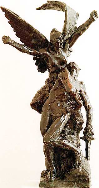 Герои характеризуются страстностью и динамикой жестов. В фигуре воина прослеживается влияние Микеланджело, с творениями которого ваятель познакомился во время путешествия по Европе в 1875. Контрастом к распластанному, теряющему жизненную силу телу мужчины служит энергичное движение — призыв к оружию — аллегорической фигуры войны и победы. Тяжелый меч, словно тянущий солдата к земле, рифмуется с легкими крыльями девушки и руками, решительно устремленными ввысь.