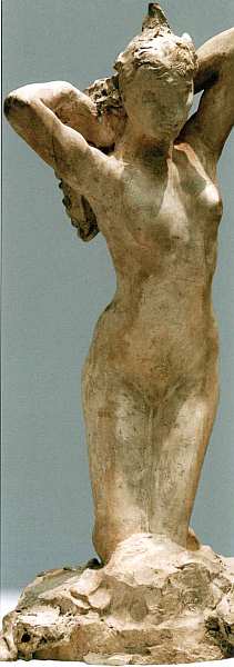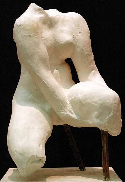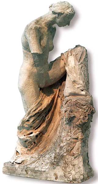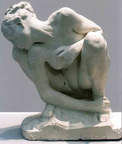 Еще одна гипсовая штудия — сидящей на корточках женщины — с блеском демонстрирует талант Родена-лепщика. Точность анатомического строения ни в коем случае не делает эту статуэтку скучной. Наоборот, верно подмеченные и переданные натянутые сухожилия шеи, напряженные колени создают эмоционально насыщенный типаж. Неизвестно, что это за героиня и каков сюжет скульптуры, но зритель сразу угадывает обостренное чувство жизни.