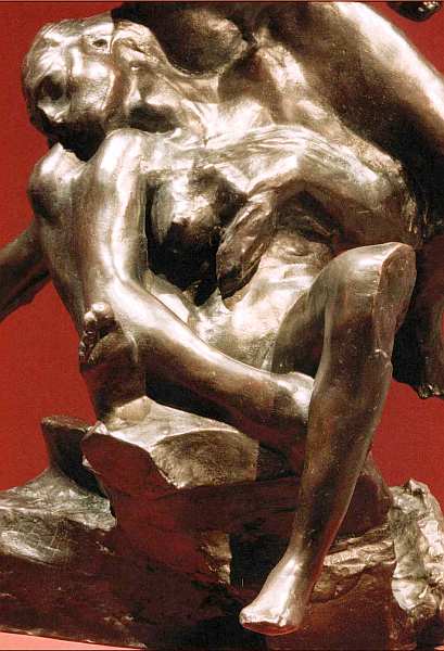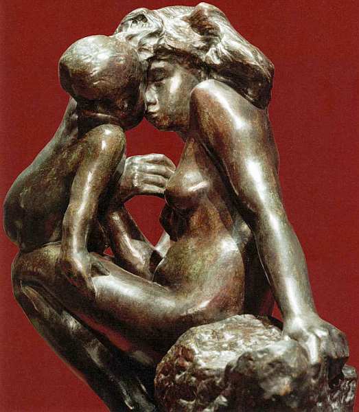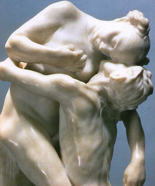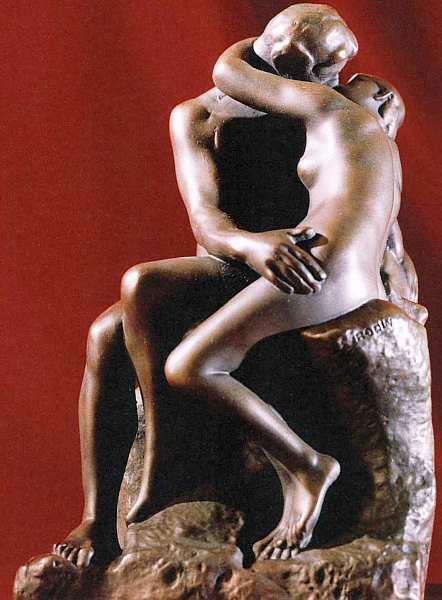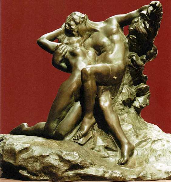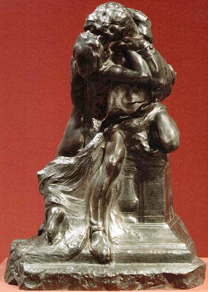 Зритель уже убедился, что Огюст Роден — настоящий певец любви и страсти. До самой старости он восхищался красотой женского тела, силой чувственного притяжения. Этой теме посвящено множество работ мастера. Он стремился осмыслить те сюжеты мировой литературы, живописи, мифологии и поэзии, которые вдохновили бы его на создание героев, охваченных пылким томлением и желанием. Такова трагическая история любви Паоло и Франчески. Она была популярна среди художников последней четверти XIX века, черпавших идеи из средневекового искусства и легенд. Отношения и трагический конец персонажей запечатлел и великий Данте в своей «Божественной комедии». Во втором круге Ада герой видит неразлучные тени Франчески да Римини и Паоло Малатесты. В 1275 красавицу выдали замуж за Джанчотто Малатесту, непривлекательного, хромого и сурового нравом знатного мужчину. Когда супруг узнал, что она вступила в любовную связь с его младшим братом Паоло, он убил их. Язык пластики традиционен для Родена — фигуры словно скользят по поверхности, они внутренне подвижны. Динамика чувств не просто подразумевается, она ощущается и захватывает внимание зрителя, даже если ему совсем не известен или не интересен сюжет скульптуры.