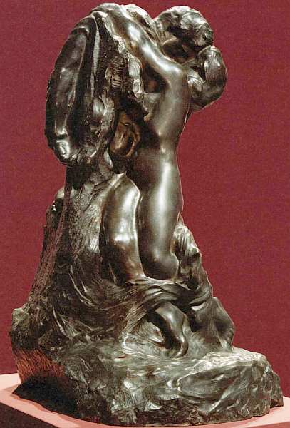 Представленная небольшая работа очень лирична. Основное в ней — жест, интимная атмосфера общения матери и дитя. Родена привлек не только этот бессловесный диалог — вечная тема европейского искусства, но и сам образ девушки, почти ребенка. Ее неуклюжее подростковое тело таит двойную загадку — пробуждение сил жизни и необъяснимый дар деторождения. Скульптор мастерски распределяет нагрузку фигур. Героиня словно балансирует на камне, ее поза нестабильна. То же самое можно сказать о младенце, сидящем у нее на коленях. Возникает чувство легкости, быстро схваченного момента, который изменится в следующую секунду. Тела, однако, уравновешены прикосновением голов. Этот контраст устойчивости бронзовых изваяний, взаимного притяжения матери и дитя и ощущения шаткости положения составляет основу художественного впечатления от работы.