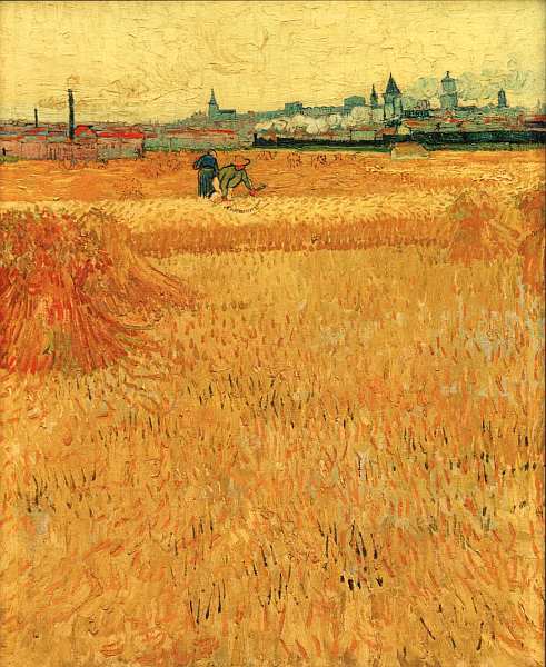 Данный пейзаж был создан в июне 1888. Он словно вобрал в себя все солнце приветливого французского Арля, крестьянских полей, их Винсент Ван Гог рисовал с особой страстью и упорством. Один из самых известных художников XX века снимал скромный домик в этих местах и каждое утро, если только позволяла погода, выходил писать виды. Так родилось множество шедевров, среди них — это, казалось бы, неприхотливое по сюжету полотно, украшающее Музей Родена в Париже. Обращает на себя внимание почти сказочный характер работы: интенсивный золотой оттенок сочетается с бледно-желтым теплым тоном неба. В солнечной дымке проступает сизый силуэт городка. Все проникнуто атмосферой размеренной крестьянской жизни и мирного труда.