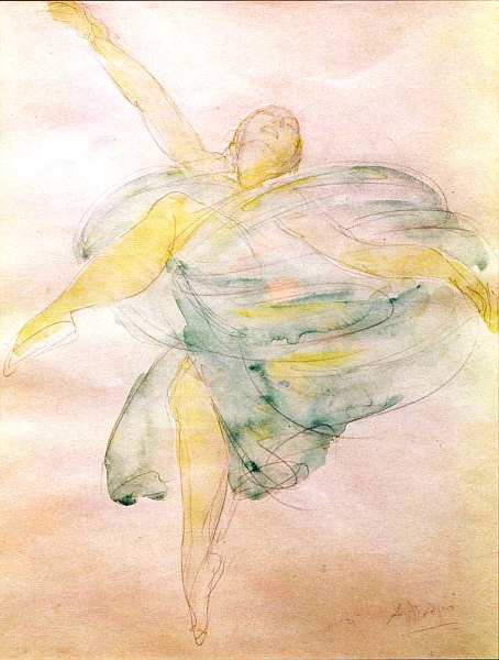 Перед зрителем один из многочисленных рисунков натурщиц, танцовщиц, обнаженных женщин в наследии Огюста Родена. Мотив танцующей девушки с вуалью неслучаен. Это не прихоть мастера, а устойчивый образ в искусстве того времени. Примерно на рубеже веков, в самом начале XX столетия, стали очень популярны авторские танцы: танец-серпантин, танец огня, где важным элементом были струящиеся юбки или вуали, которые обыгрывали и дополняли движения исполнительниц, наиболее прославленные из которых — обосновавшаяся в Париже американка Лои Фуллер и Айседора Дункан. Рисунки, скульптуры, гравюры с изображением танца с вуалью создали многие известные мастера, в частности француз Анри Тулуз-Лотрек и австриец Коломан Мозер.