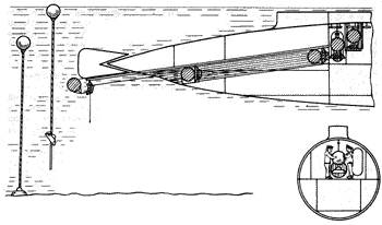 Корпус подводного минного заградителя представлял собой клепаный цилиндр с коническими оконечностями. Внутри корпуса имелись две цилиндрические балластные цистерны 7 . Водоизмещение заградителя было всего 25 т. Он должен был быть вооружен четырьмя минами или двумя торпедами Шварцкопфа 8 - по желанию. Мины предполагалось ставить через специальный люк в середине корпуса лодки "под себя". В последующих проектах Налетов от такой системы постановки мин отказался, считая, что она весьма опасна для самой лодки, так как при постановке мин она может стать жертвой одной из них. Этот вывод Михаила Петровича, справедливый для того времени, впоследствии подтвердился на практике. Немцы на своих первых серийных подводных заградителях типа UC применили именно эту систему постановки мин, в результате чего некоторые из лодок стали жертвами собственных мин.