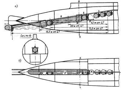 Первый вариант подводного минного заградителя водоизмещением 300 т: а - продольный вертикальный разрез, б - продольный горизонтальный разрез.