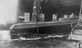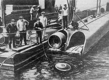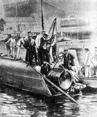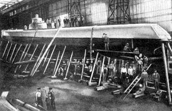 Осенью постройка корпуса заградителя была закончена, и Налетов приступил к испытаниям прочности и водонепроницаемости корпуса. Для погружения лодки на месте без людей он использовал чугунные чушки, которые укладывались на палубе лодки, а для всплытия снимались с помощью плавучего крана. Этот же кран предполагалось использовать для подъема лодки в случае, если бы она не выдержала испытаний и заклепочные швы дали бы течь, а лодка после снятия с нее балласта не смогла бы всплыть. Заградитель погружался на 9 м 9 . Все испытания прошли благополучно. Интересно заметить, что уже во время испытаний был назначен командир лодки - мичман Б. А. Вилькицкий.