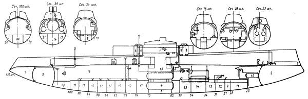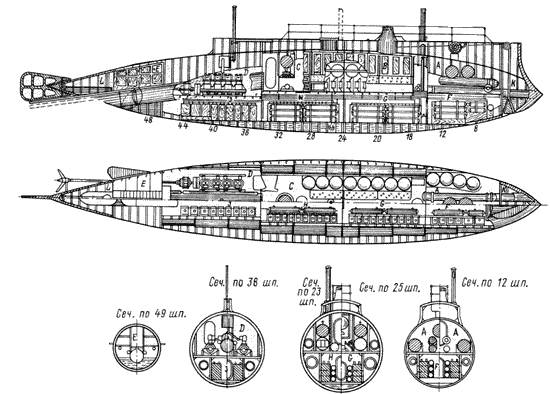 A, B, C - 1-е, 2-е и 3-е минные отделения; D - машинное отделение; E - помещение для провизии; F, G, H, I - 1-е, 2-е 3-е и 4-е аккумуляторные отделения; K, L - носовая и кормовая дифферентные балластные цистерны