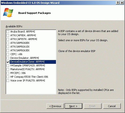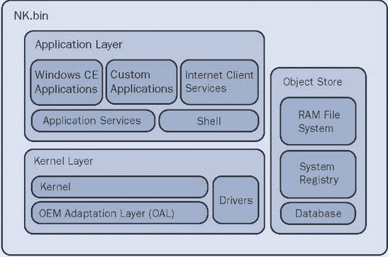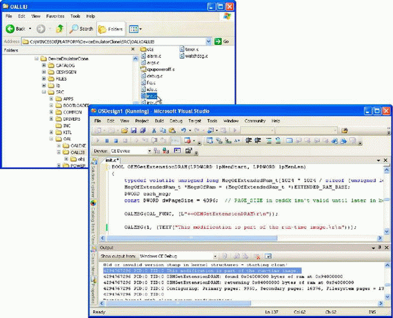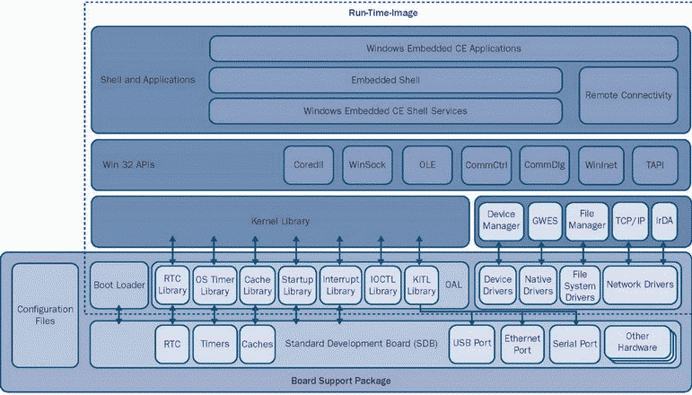 Windows Embedded CE 6.0 is extraordinarily modular in its design and supports ARM-, MIPS-, SH4-, and x86-based boards in a multitude of hardware configurations. The CE kernel contains the core OS code and the platform-specific code resides in the OAL and in device drivers. In fact, device drivers are the largest part of the BSP for an OS design. Rather than accessing the hardware directly, the operating system loads the corresponding device drivers, and then uses the functions and I/O services that these drivers provide.